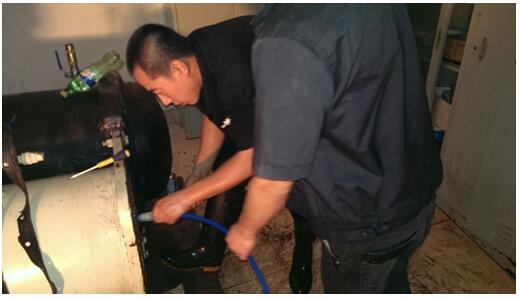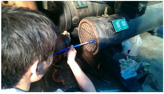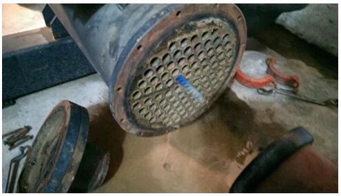 4、 打開冷凝器端蓋,用沖炮機(jī)清刷第根銅管